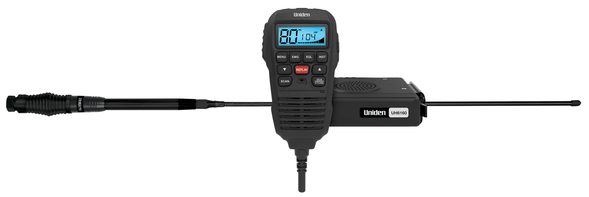 Uniden’s innovative one touch instant replay allows you to record and replay up to 19 minutes of recently received communications meaning you won’t miss any important transmissions. The UH6160 Escape Pack is also equipped with Triple Watch which will continuously monitor the instant priority channels stored along with your current channel logged on ensuring you can monitor three channels at once. The UH6160 Escape Pac the ultimate in compact UHF communications with a trade quality build and engineered for rugged Australian and New Zealand conditions makes it ideal for the truck drivers, 4WD Drivers and Caravan Drivers. What differs from this against our other models in our range is the large LCD Display on the Speaker Microphone. Uniden’s reliability and experience in UHF makes this unit ideal for the professional who needs to keep in touch with the outside world. The UH6160 offers the finest components, engineering and styling, just what you would expect from Uniden. The UH6160 has dual speakers in both the speaker microphone and base unit allowing for clear and loud volume ideal in a noisy vehicle. Equipped with a Remote Speaker Microphone with a built-in oversized LCD Backlit Screen allows flexible control of all functions and features remotely with one touch buttons (Instant, Call, Mon and EMG Buttons) on the mic. The UH6160 is a 5W unit with some excellent features including 7 Colour LCD to suit your vehicle interior and Duplex Capabilities for Extended range.